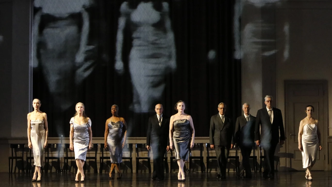 Neun Tänzer:innen, gekleidet in formelle Anzüge und Satinkleider, erzeugen eine Ballsaal-Atmosphäre der 1930er-Jahre. Sie trotzen immer wieder den Zeichen des Alterns, füllen mit ihren Bewegungen den Bühnenraum, mal raumgreifend, mal eng umschlungen. Sie raffen sich auf, um dann wieder zu verlangsamen. Lücken entstehen durch jene zwölf Tänzer:innen, die nicht mehr dabei sein können, und werden bewusst nicht ersetzt. Ihre Abwesenheit soll spürbar werden. Melancholie erfüllt den Raum, wenn vereinzelt ohne Partner:in getanzt wird. Der direkte Blick ins Publikum ist kraftvolle, bewusste Konfrontation.